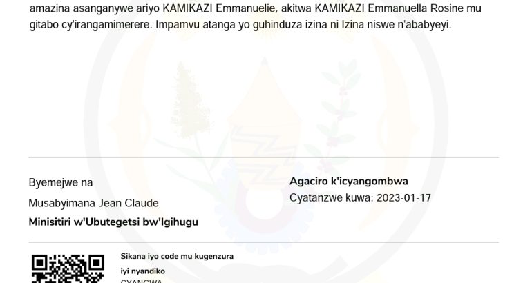 Turamenyesha ko uwitwa KAMIKAZI Emmanuelie mwene Mishahi Emmanuel na Nyirabakina Beatrice, utuye mu Mudugudu wa Umunezero, Akagari ka Amahoro, Umurenge wa Gisenyi, Akarere ka Rubavu, mu Ntara y’Iburengerazuba wanditse asaba uburenganzira bwo guhinduza amazina asanganywe ariyo KAMIKAZI Emmanuelie, akitwa KAMIKAZI Emmanuella Rosine mu gitabo cy’irangamimerere.