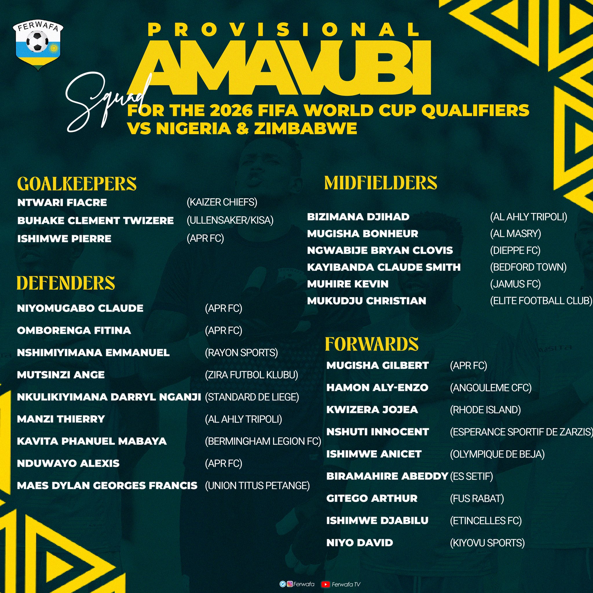 Ishyirahamwe ry’Umupira w’Amaguru mu Rwanda (FERWAFA) ryamaze gutangaza urutonde rw’agateganyo rw’Amavubi ruzifashishwa mu mikino ikomeye yo gushaka itike y’igikombe cy’Isi 2026 aho bazahura na Nigeria ndetse na Zimbabwe.