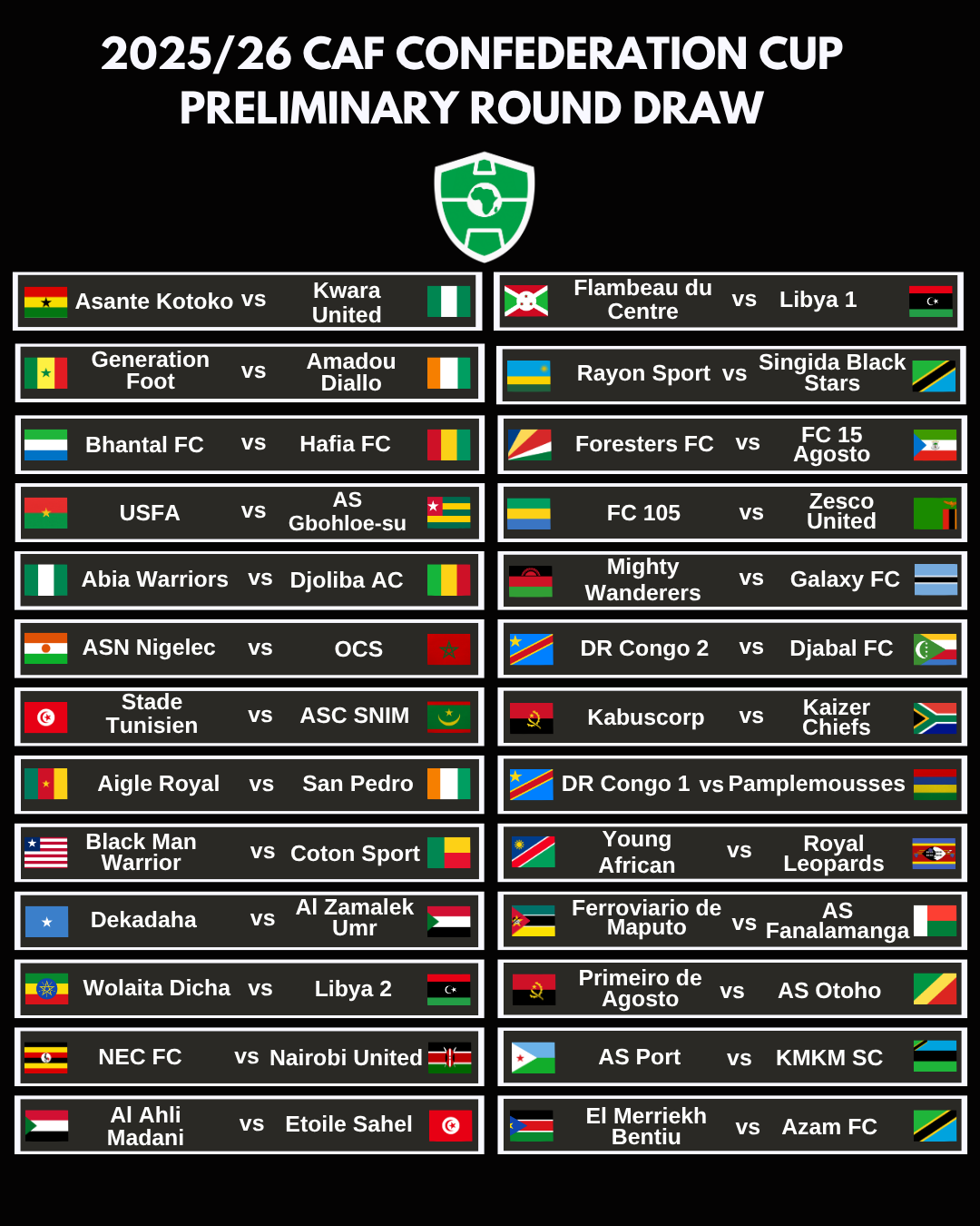 Biteganyijwe ko umukino wa mbere uzakinirwa i Kigali kuri APR FC na Rayon Sports, naho uwo kwishyura kuri APR uzabera mu Misiri naho kuri Rayon Sports ukazabera muri Tanzania.