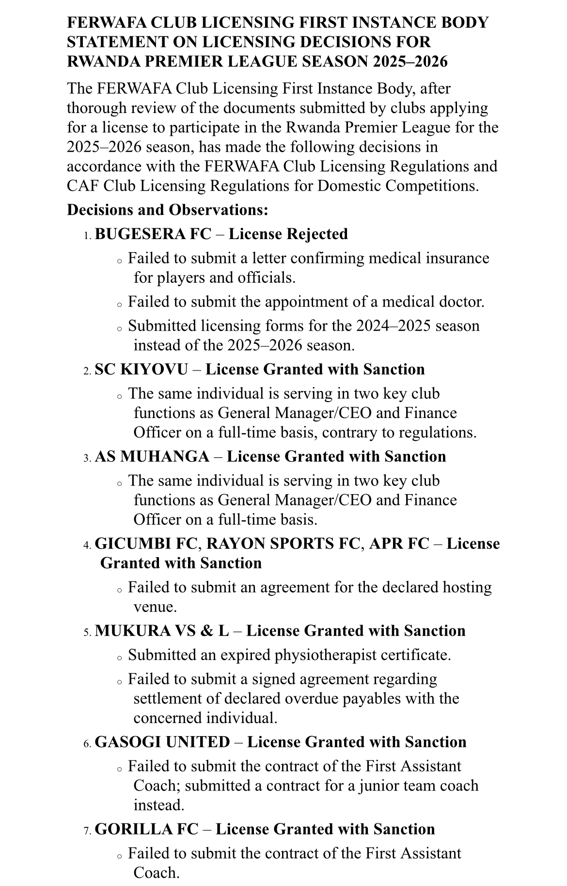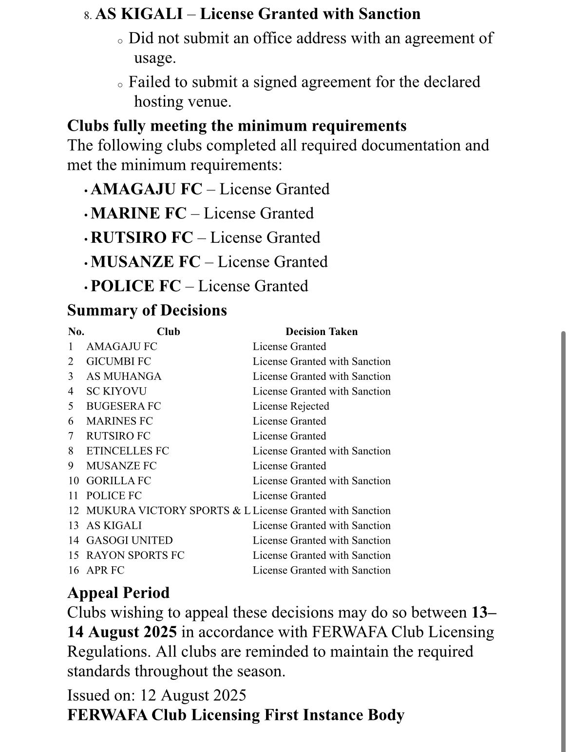 Amakipe yose atahawe uburenganzira cyangwa ahabwa uburenganzira buherekejwe n’ibihano yemerewe kujurira hagati ya tariki ya 13 na 14 Kanama 2025.