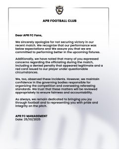 Kuri uyu wa Gatandatu tariki ya 25 Ukwakira 2025; Ubuyobozi bwa APR Football Club bwasabye imbabazi abafana bayo nyuma yo kudatanga umusaruro wari witezwe mu mukino bahuyemo na Kiyovu SC ukarangira banganya ubusa ku busa.