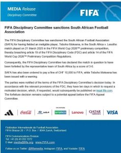 Mu itangazo ryasohotse ku wa Mbere, tariki ya 29 Nzeri 2025, Komite ishinzwe imyitwarire muri FIFA yemeje ko Bafana Bafana baterwa mpaga ibitego 3-0, inacibwa ihazabu ya 12,541$.