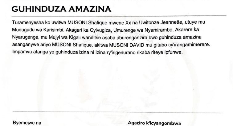 Yasabye uburenganzira bwo gusimbuza izina Shafique izina David, akitwa MUSONI David mu irangamimerere.