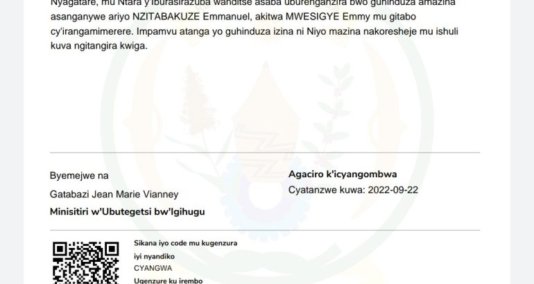 Nyagatare, mu Ntara y’Iburasirazuba wanditse asaba uburenganzira bwo guhinduza amazina asanganywe ariyo NZITABAKUZE Emmanuel, akitwa MWESIGYE Emmy mu gitabo cy’irangamimerere.