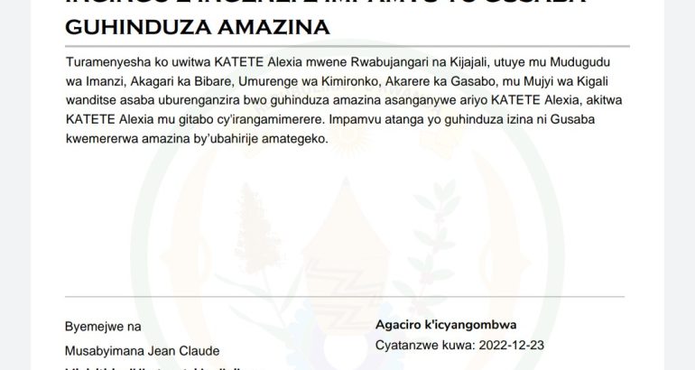 wanditse asaba uburenganzira bwo guhinduza amazina asanganywe ariyo KATETE Alexia, akitwa