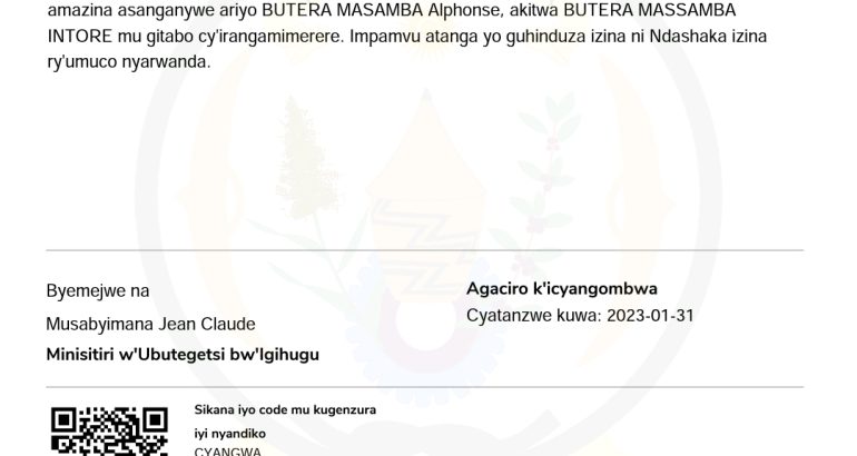 Turamenyesha ko uwitwa BUTERA MASAMBA Alphonse mwene Sentore Athanase na Mukarugagi Ancila, utuye mu Mudugudu wa Karisimbi, Akagari ka Kibagabaga, Umurenge wa Kimironko, Akarere ka Gasabo, mu Mujyi wa Kigali wanditse asaba uburenganzira bwo guhinduza amazina asanganywe ariyo BUTERA MASAMBA Alphonse, akitwa BUTERA MASSAMBA INTORE mu gitabo cy’irangamimerere. Impamvu atanga yo guhinduza izina ni Ndashaka izina ry’umuco nyarwanda.