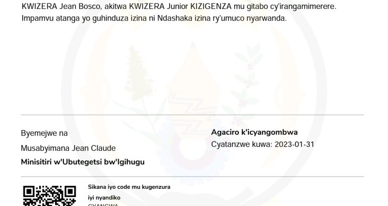 Turamenyesha ko uwitwa KWIZERA Jean Bosco mwene Mugenzi na Muhayimpundu, utuye mu Mudugudu wa Rebero, Akagari ka Nyarurama, Umurenge wa Kigarama, Akarere ka Kicukiro, mu Mujyi wa Kigali wanditse asaba uburenganzira bwo guhinduza amazina asanganywe ariyo KWIZERA Jean Bosco, akitwa KWIZERA Junior KIZIGENZA mu gitabo cy’irangamimerere. Impamvu atanga yo guhinduza izina ni Ndashaka izina ry’umuco nyarwanda.