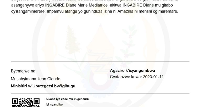 Turamenyesha ko uwitwa INGABIRE Diane Marie Médiatrice mwene Kanamugire na Nishimwe, utuye mu Mudugudu wa Rwimikoni Ii, Akagari ka Mbyo, Umurenge wa Mayange, Akarere ka Bugesera, mu Ntara y’Iburasirazuba wanditse asaba uburenganzira bwo guhinduza amazina asanganywe ariyo INGABIRE Diane Marie Médiatrice, akitwa INGABIRE Diane mu gitabo cy’irangamimerere. Impamvu atanga yo guhinduza izina ni Amazina ni menshi cg maremare.