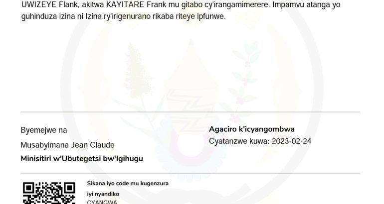 Turamenyesha ko uwitwa UWIZEYE Flank mwene Bazatoha na Kanazayire, utuye mu Mudugudu wa Gihunika, Akagari ka Nyamatete, Umurenge wa Rwimbogo, Akarere ka Gatsibo, mu Ntara y’Iburasirazuba wanditse asaba uburenganzira bwo guhinduza amazina asanganywe ariyo UWIZEYE Flank, akitwa KAYITARE Frank mu gitabo cy’irangamimerere. Impamvu atanga yo guhinduza izina ni Izina ry’irigenurano rikaba riteye ipfunwe.