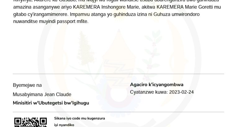 Turamenyesha ko uwitwa KAREMERA Inshongore Marie mwene Ntamanyoma Bonaventure na Kantarama Costasia, utuye mu Mudugudu wa Gacuriro 2020, Akagari ka Gacuriro, Umurenge wa Kinyinya, Akarere ka Gasabo, mu Mujyi wa Kigali wanditse asaba uburenganzira bwo guhinduza amazina asanganywe ariyo KAREMERA Inshongore Marie, akitwa KAREMERA Marie Goretti mu gitabo cy’irangamimerere. Impamvu atanga yo guhinduza izina ni Guhuza umwirondoro nuwanditse muyindi passport mfite.