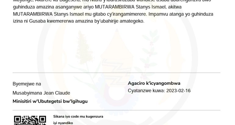 Turamenyesha ko uwitwa MUTARAMBIRWA Stanys Ismael mwene Ngayaberuye Jean Samson na Izabiriza Esther, utuye mu Mudugudu wa Kavumu, Akagari ka Gakamba, Umurenge wa Mayange, Akarere ka Bugesera, mu Ntara y’Iburasirazuba wanditse asaba uburenganzira bwo guhinduza amazina asanganywe ariyo MUTARAMBIRWA Stanys Ismael, akitwa MUTARAMBIRWA Stanys Ismael mu gitabo cy’irangamimerere.