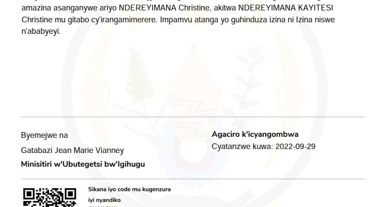 Turamenyesha ko uwitwa NDEREYIMANA Christine mwene Ndereyimana Andre na Nyiramafaranga Regine, utuye mu Mudugudu wa Gasharu, Akagari ka Kamutwa, Umurenge wa Kacyiru, Akarere ka Gasabo, mu Mujyi wa Kigali wanditse asaba uburenganzira bwo guhinduza amazina asanganywe ariyo NDEREYIMANA Christine, akitwa NDEREYIMANA KAYITESI Christine mu gitabo cy’irangamimerere. Impamvu atanga yo guhinduza izina ni Izina niswe n’ababyeyi.