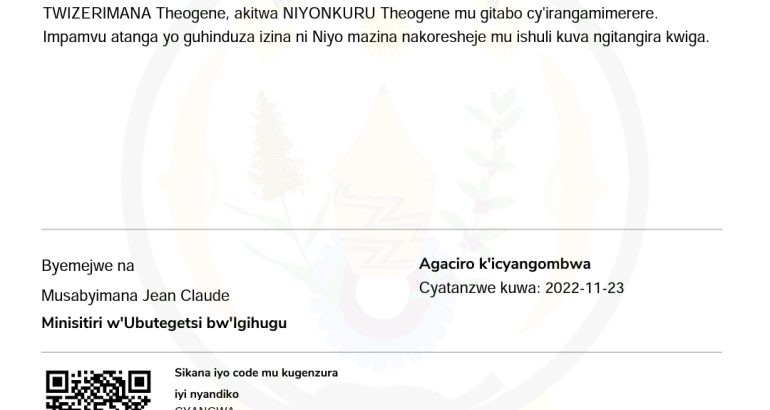 Turamenyesha ko uwitwa TWIZERIMANA Theogene mwene Hitimana na Nyirambanjinka, utuye mu Mudugudu wa Nyakabungo, Akagari ka Juru, Umurenge wa Gahini, Akarere ka Kayonza, mu Ntara y’Iburasirazuba wanditse asaba uburenganzira bwo guhinduza amazina asanganywe ariyo TWIZERIMANA Theogene, akitwa NIYONKURU Theogene mu gitabo cy’irangamimerere. Impamvu atanga yo guhinduza izina ni Niyo mazina nakoresheje mu ishuli kuva ngitangira kwiga.