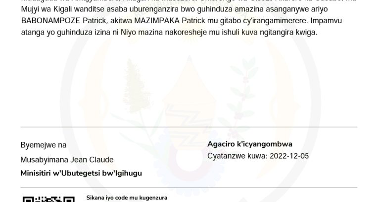 Turamenyesha ko uwitwa BABONAMPOZE Patrick mwene Dushimirema na Banyagiriki, utuye mu Mudugudu wa Amajyambere, Akagari ka Musezero, Umurenge wa Gisozi, Akarere ka Gasabo, mu Mujyi wa Kigali wanditse asaba uburenganzira bwo guhinduza amazina asanganywe ariyo BABONAMPOZE Patrick, akitwa MAZIMPAKA Patrick mu gitabo cy’irangamimerere. Impamvu atanga yo guhinduza izina ni Niyo mazina nakoresheje mu ishuli kuva ngitangira kwiga.