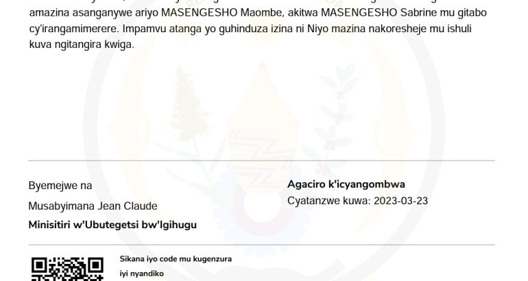 Turamenyesha ko uwitwa MASENGESHO Maombe mwene Kwizera Alphred na Nirere Donathille, utuye mu Mudugudu wa Mugwato, Akagari ka Cyimanzovu, Umurenge wa Shyira, Akarere ka Nyabihu, mu Ntara y’Iburengerazuba wanditse asaba uburenganzira bwo guhinduza amazina asanganywe ariyo MASENGESHO Maombe, akitwa MASENGESHO Sabrine mu gitabo cy’irangamimerere. Impamvu atanga yo guhinduza izina ni Niyo mazina nakoresheje mu ishuli kuva ngitangira kwiga.