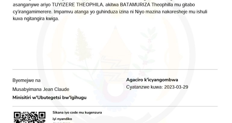 Turamenyesha ko uwitwa TUYIZERE THEOPHILA mwene Muvunyi Samuel na Musengimana, utuye mu Mudugudu wa Byimana, Akagari ka Kitazigurwa, Umurenge wa Muhazi, Akarere ka Rwamagana, mu Ntara y’Iburasirazuba wanditse asaba uburenganzira bwo guhinduza amazina asanganywe ariyo TUYIZERE THEOPHILA, akitwa BATAMURIZA Theophilla mu gitabo cy’irangamimerere. Impamvu atanga yo guhinduza izina ni Niyo mazina nakoresheje mu ishuli kuva ngitangira kwiga.
