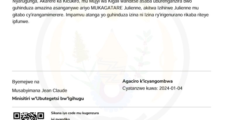 Turamenyesha ko uwitwa MUKAGATARE Julienne mwene Munyandamutsa Jean de dieu na Uwimana Francoise, utuye mu Mudugudu wa Nyarutovu, Akagari ka Nonko, Umurenge wa Nyarugunga, Akarere ka Kicukiro, mu Mujyi wa Kigali wanditse asaba uburenganzira bwo guhinduza amazina asanganywe ariyo MUKAGATARE Julienne, akitwa Izihirwe Julienne mu gitabo cy’irangamimerere. Impamvu atanga yo guhinduza izina ni Izina ry’irigenurano rikaba riteye ipfunwe.