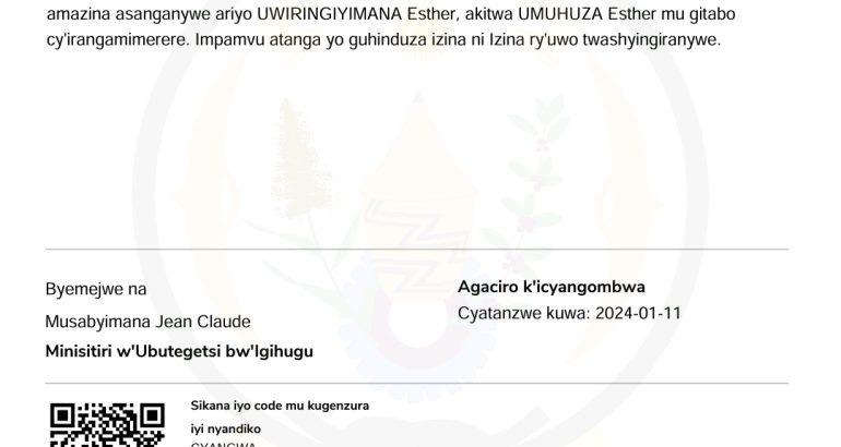 Turamenyesha ko uwitwa UWIRINGIYIMANA Esther mwene Ntarazama Timothee na Uzamushaka Alphonsine, utuye mu Mudugudu wa Ruhogo, Akagari ka Rudashya, Umurenge wa Ndera, Akarere ka Gasabo, mu Mujyi wa Kigali wanditse asaba uburenganzira bwo guhinduza amazina asanganywe ariyo UWIRINGIYIMANA Esther, akitwa UMUHUZA Esther mu gitabo cy’irangamimerere. Impamvu atanga yo guhinduza izina ni Izina ry’uwo twashyingiranywe.