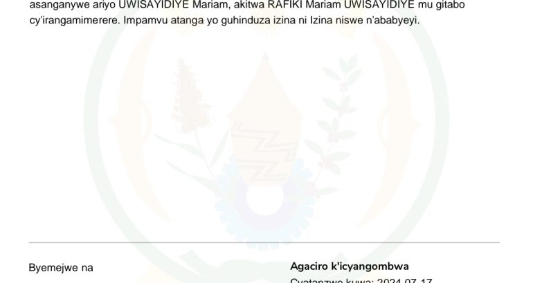 Nyarugenge, mu Mujyi wa Kigali wanditse asaba uburenganzira bwo guhinduza amazina asanganywe ariyo UWISAYIDIYE Mariam, akitwa RAFIKI Mariam UWISAYIDIYE mu gitabo