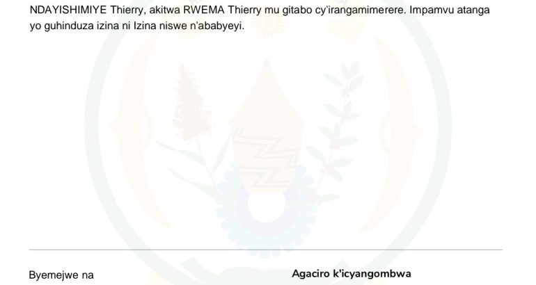 NDAYISHIMIYE Thierry, akitwa RWEMA Thierry mu gitabo cy’irangamimerere.