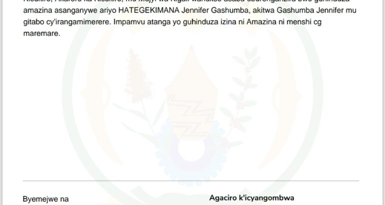 Turamenyesha ko uwitwa HATEGEKIMANA Jennifer Gashumba mwene Gashumba Jean na Mukakinani Clothilde, utuye mu Mudugudu wa Ubumwe, Akagari ka Kicukiro, Umurenge wa Kicukiro, Akarere ka Kicukiro, mu Mujyi wa Kigali wanditse asaba uburenganzira bwo guhinduza amazina asanganywe ariyo HATEGEKIMANA Jennifer Gashumba, akitwa Gashumba Jennifer mu gitabo cy’irangamimerere.