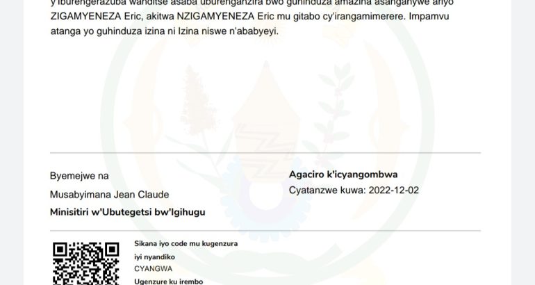 ZIGAMYENEZA Eric, akitwa NZIGAMYENEZA Eric mu gitabo cy’irangamimerere. Impamvu