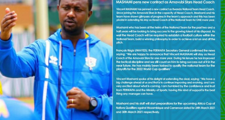 Binyuze ku rubuga rwa Twitter rw’ishyirahamwe ry’umupira w’amaguru mu Rwanda FERWAFA ndetse na Minisiteri ya siporo MINISPORTS batangaje ko umutoza Mashami Vincent ariwe ukomeza gutoza Amavubi mu cy’umwaka umwe uri imbere.
