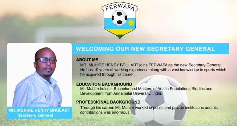 Ishyirahamwe ry’umupira w’amaguru mu Rwanda FERWAFA, ryamaze gutangaza ko ryabonye umunyamabanga mushya ariwe MUHIRE Henry Brulart waje kuri uyu mwanya asimbuye Uwayezu Francois Regis wari wasezeye kuri uyu mwanya mu kwezi k’Ugushyingo.