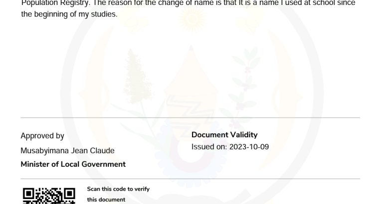 We inform you that the named MUKASIBOMANA Mutoniwase Diane, son/daughter of – and Vuguziga, domiciled at Rwagasiga village, Kabuye cell, Gashora sector, Bugesera district, in the Eastern Province applied for the authorization of the change of name from his current name MUKASIBOMANA Mutoniwase Diane to be called Umutoniwase Hope Diane in the National Population Registry.