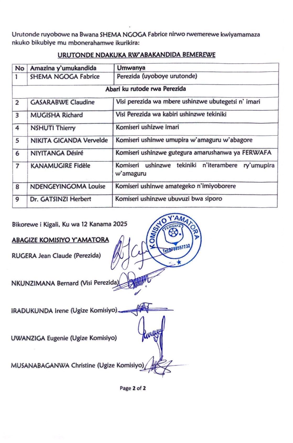 Komisiyo y’amatora ya FERWAFA yatangaje urutonde ntakuka rw’abemerewe kwiyamamaza mu matora ya Komite Nyobozi ya FERWAFA ateganyijwe ku wa 30 Kanama 2025, aho Ngoga Fabrice ari we mukandida rukumbi ku mwanya w’umuyobozi mukuru.