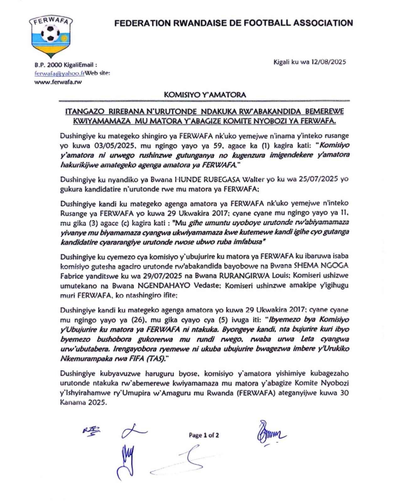 Komisiyo y’amatora ya FERWAFA yatangaje urutonde ntakuka rw’abemerewe kwiyamamaza mu matora ya Komite Nyobozi ya FERWAFA ateganyijwe ku wa 30 Kanama 2025, aho Ngoga Fabrice ari we mukandida rukumbi ku mwanya w’umuyobozi mukuru.