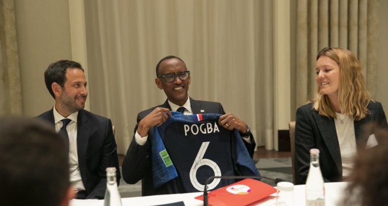 Muri ibyo biganiro Perezida Kagame akaba yarashyikirijwe impano y’umwambaro w’umukinnyi w’u Bufaransa, Paul Pogba, umwe mu bafashije iki gihugu kwegukana Igikombe cy’Isi cya 2018 cyabereye mu Burusiya mu mwaka ushize.