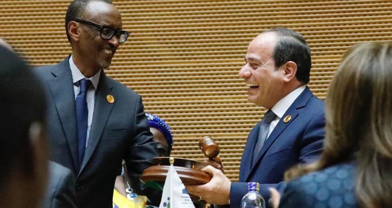 Perezida Kagame yashyikirije inkoni y’Ubuyobozi umuyobozi mushya w’Umuryango wa Afurika yunze Ubumwe ari we Abdel Fattah el-Sisi, usanzwe ari perezida wa Misiri.