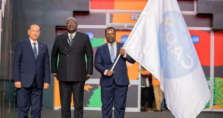 Dr Mansourou Aremou, uyobora ishyirahamwe ry’Umukino wa Handball muri Afurika (CAHB) yahereje ibendera ry’Impuzamashyirahamwe y’uyu mukino kuri Perezida w’Ishyirahamwe ryo mu Rwanda (FERWAHAND), Twahirwa Alfred, nk’ikimenyetso cyo kuzakira imikino.